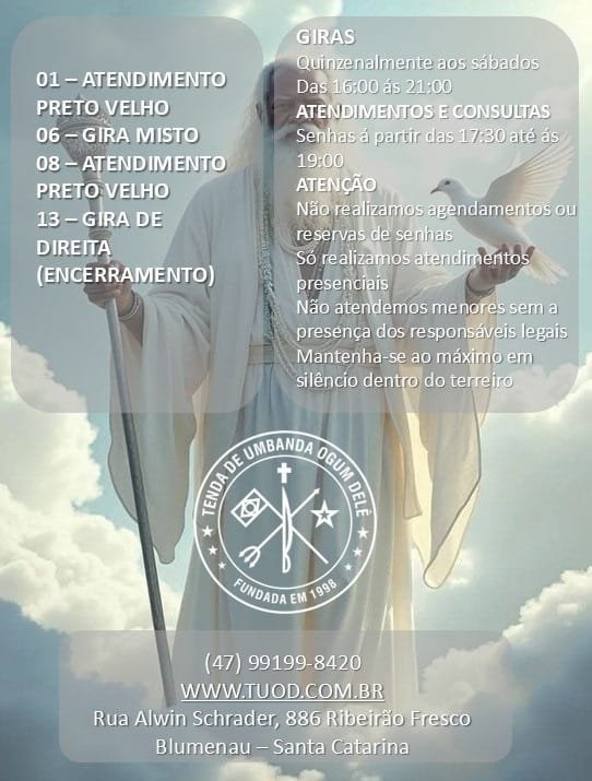 Caso queira conhecer nossos trabalhos ou entender um pouco sobre o culto de umbanda, recomendamos que venha aos nossos giras que acontecem quinzenalmente ao sábados com início ás 16:00.